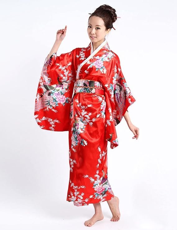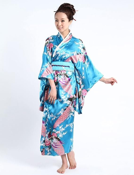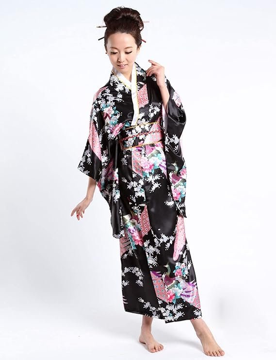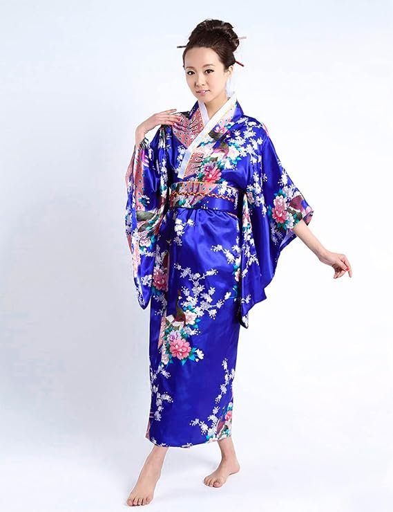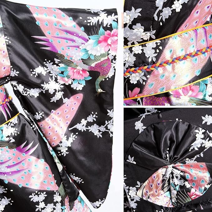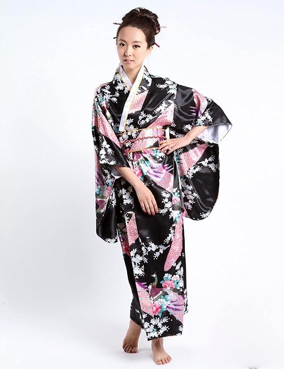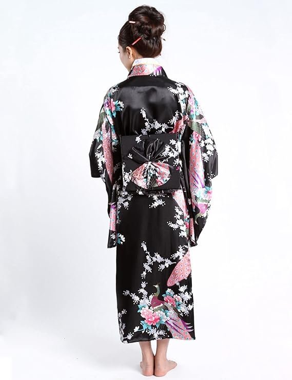 Diseño: Presenta un estampado clásico de pavo real o sakura (flores de cerezo), símbolos tradicionales de belleza y renovación en la cultura japonesa. El kimono es de longitud hasta el tobillo, con mangas amplias y sueltas que permiten una movilidad cómoda. El escote en forma de V y el cinturón obi ajustable con un lazo en la parte posterior realzan la figura femenina.